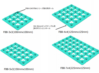 ・M6 25mmピッチ(M4 20mmピッチ対応)テーブル用取付ポジションホール付き・光アダプタプレート取付可能・光ファイバークランプ用キャップ取付可能